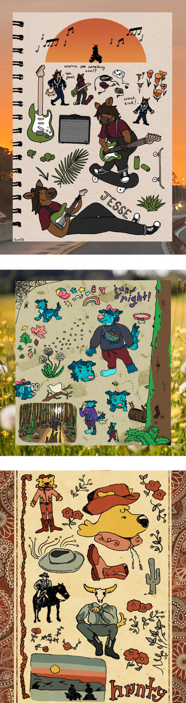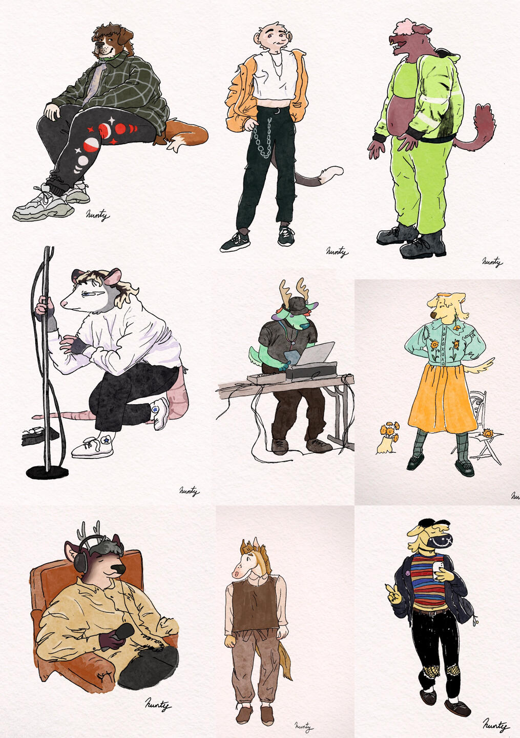 heyo! i’m hunty and i’m a queer artist in the atlanta area! (they/she/he)my personal work tends to be a reflection of the things i enjoy seeing particularly in the natural, perhaps mundane, world, often featuring anthropomorphic characters and a hint of psychedelia.feel free to contact me via any of my social media DMs or by email, [email protected].