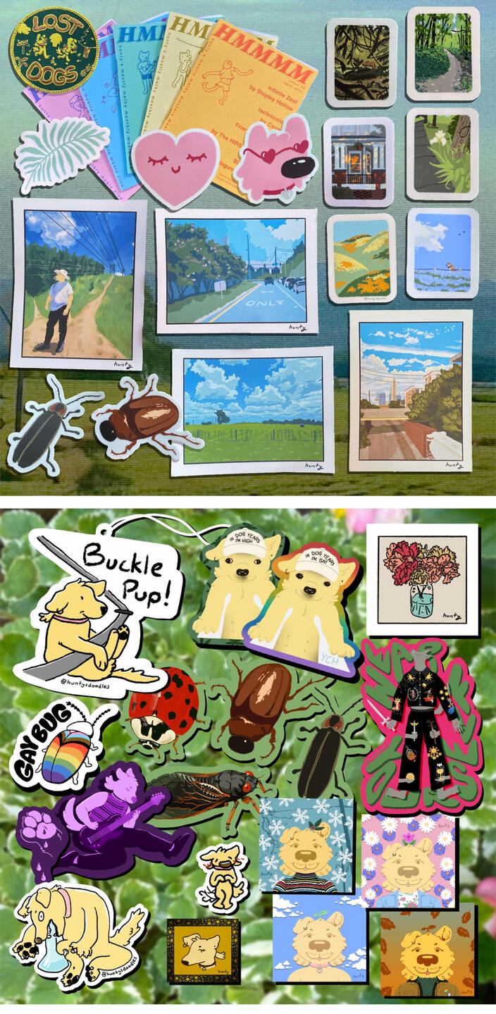 Heyo! I’m Hunty (or Hunter) and I’m a queer artist in the atlanta area! (they/she)My personal work tends to be a reflection of the things i enjoy seeing particularly in the natural world, often featuring anthropomorphic characters and a hint of psychedelia.I make a lot of sticker designs and small art prints to sell online, through my Patreon, and at in-person events such as live local music shows, Pride celebrations/Queer art markets, or Furry events/conventions. My philosophy with in-person selling in particular is to give anyone the opportunity to leave my table with something that makes them smile, whether or not they have the means to “purchase” something.In general, I want to connect to people with my art, and give a similar experience of comfort with oneself and, through that, a freedom to fully and honesty express oneself within the safe space of the community. This is something I’ve experienced through other people’s art that I want to bring through my work.Feel free to contact me via any of my social media DMs or by email, [email protected]. Thanks so much for visiting my site! 💖